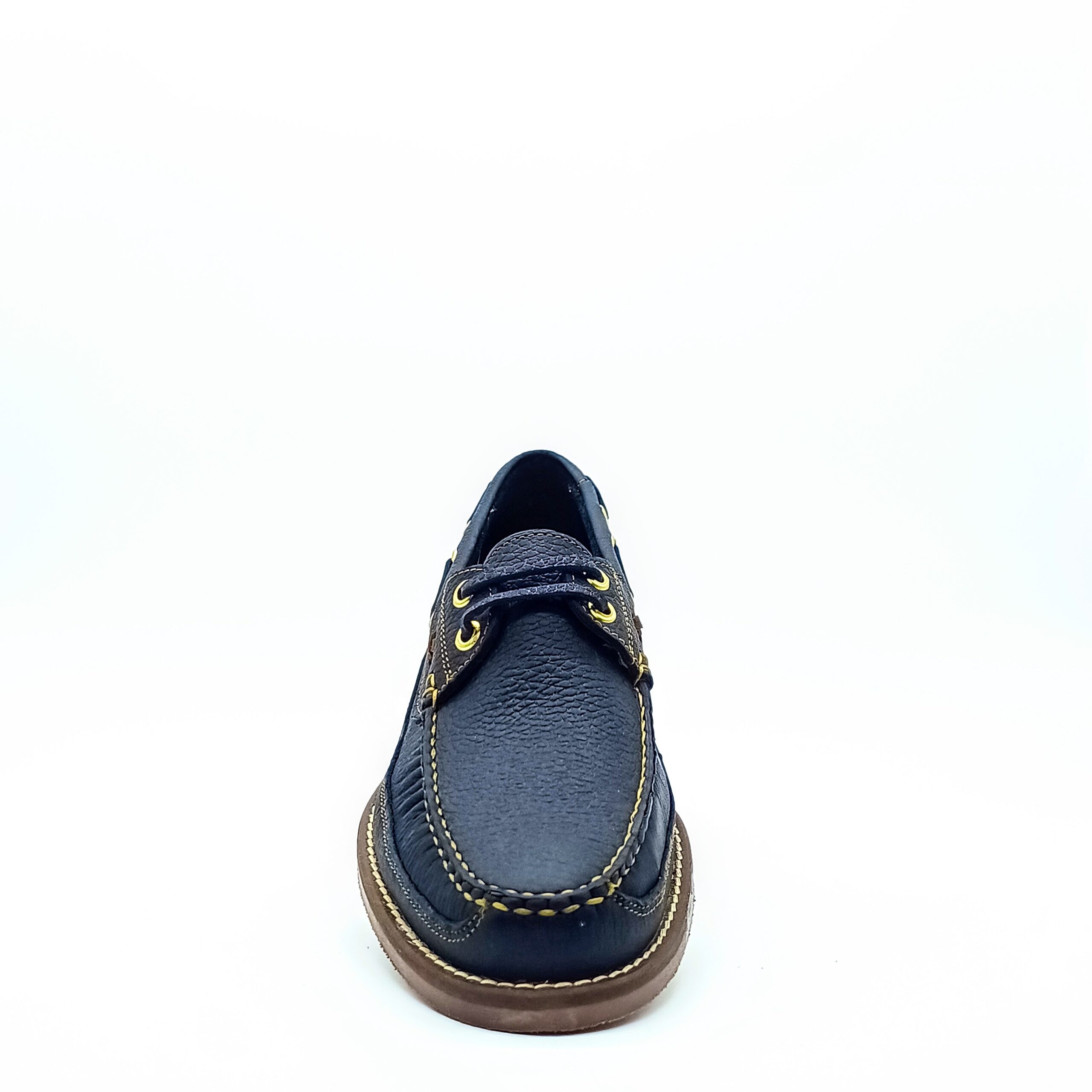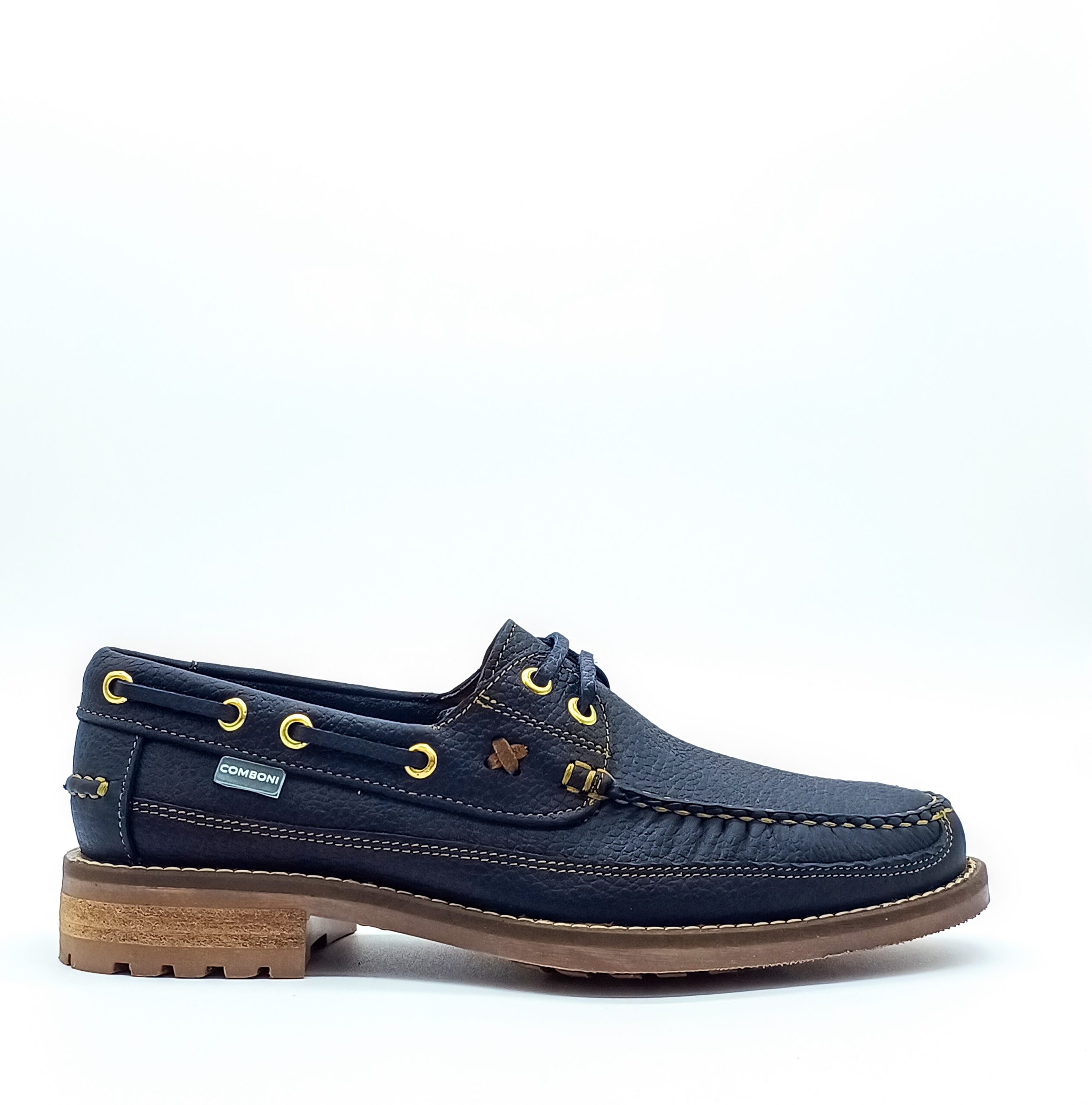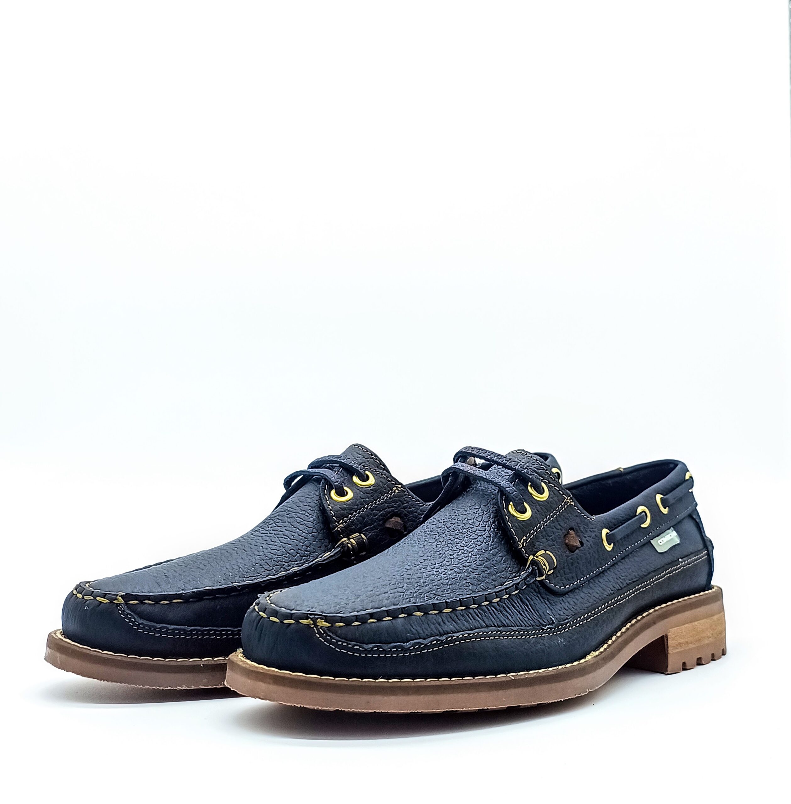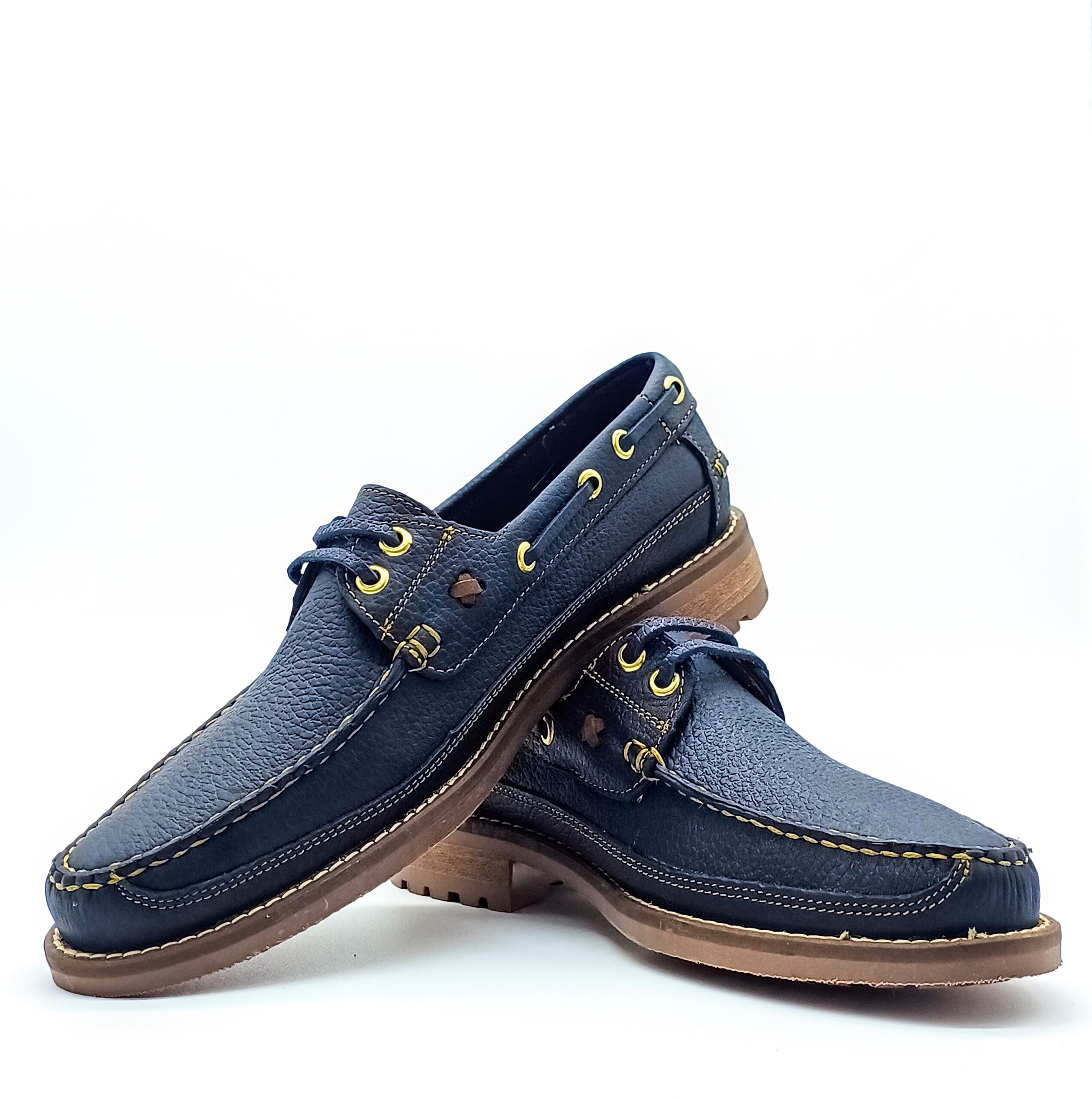 Mocasín elaborado en piel Grasso 100% color azul, destacan su tejido a mano y su suela alta con contrastes amaderados, su interior cuenta con forro de res y plantilla confort.