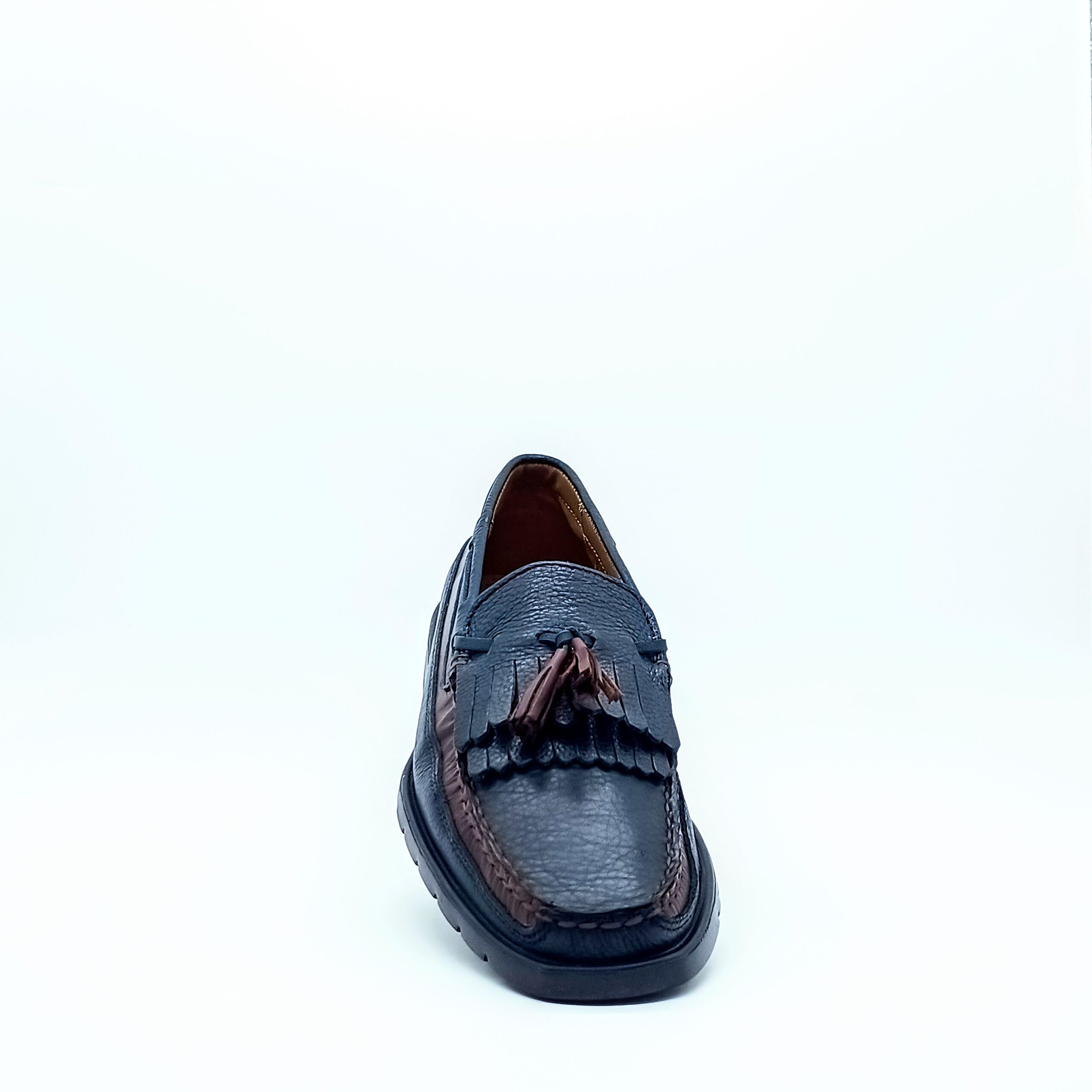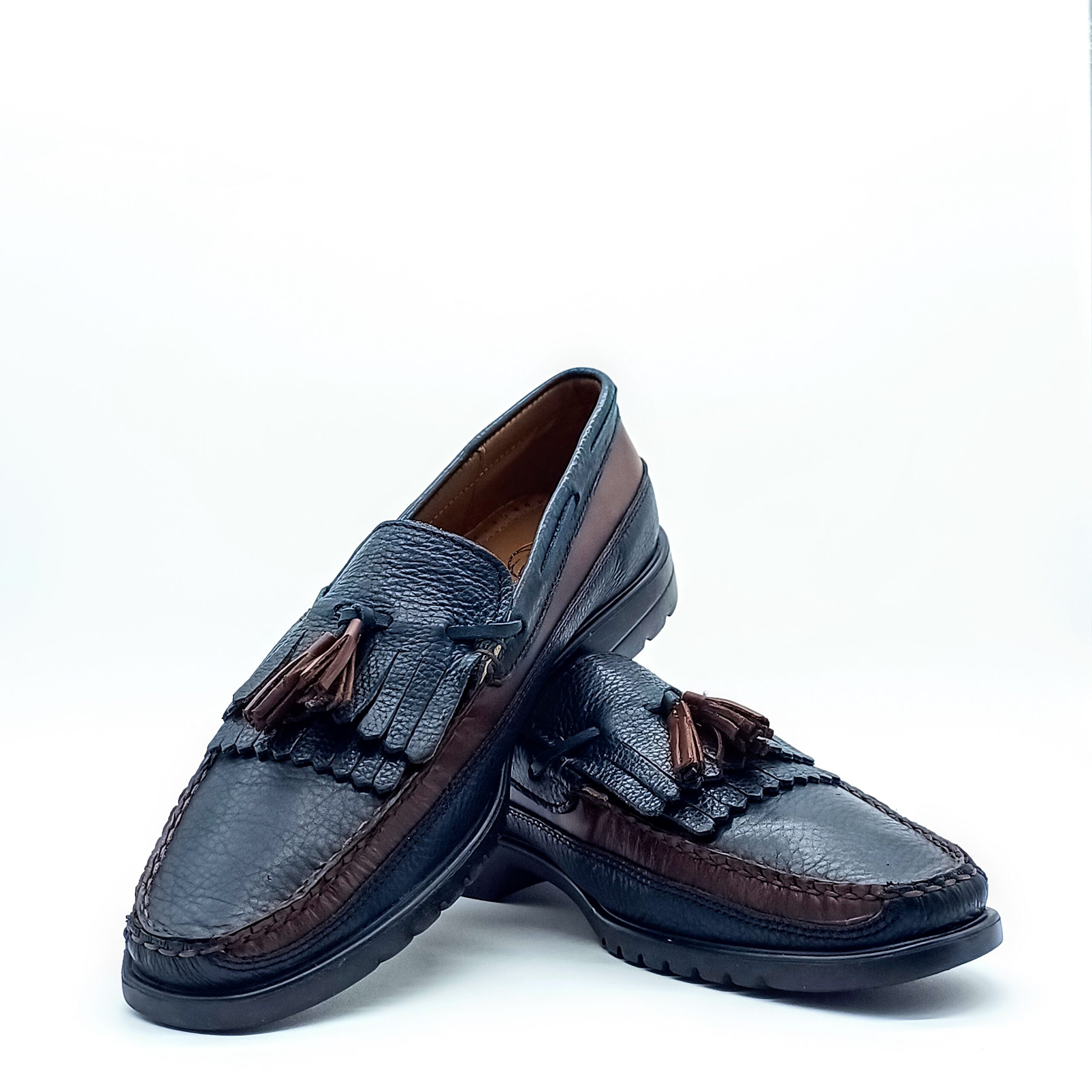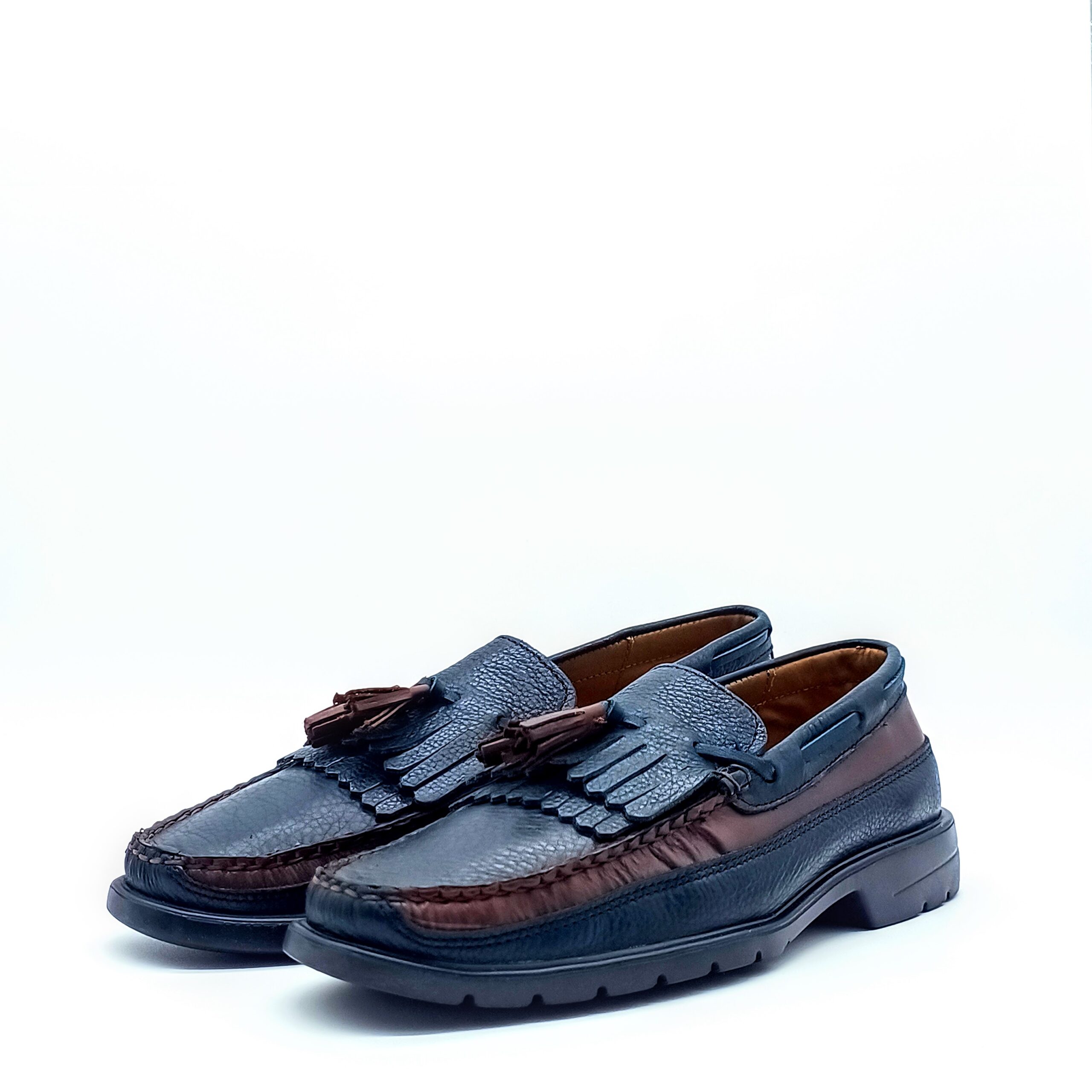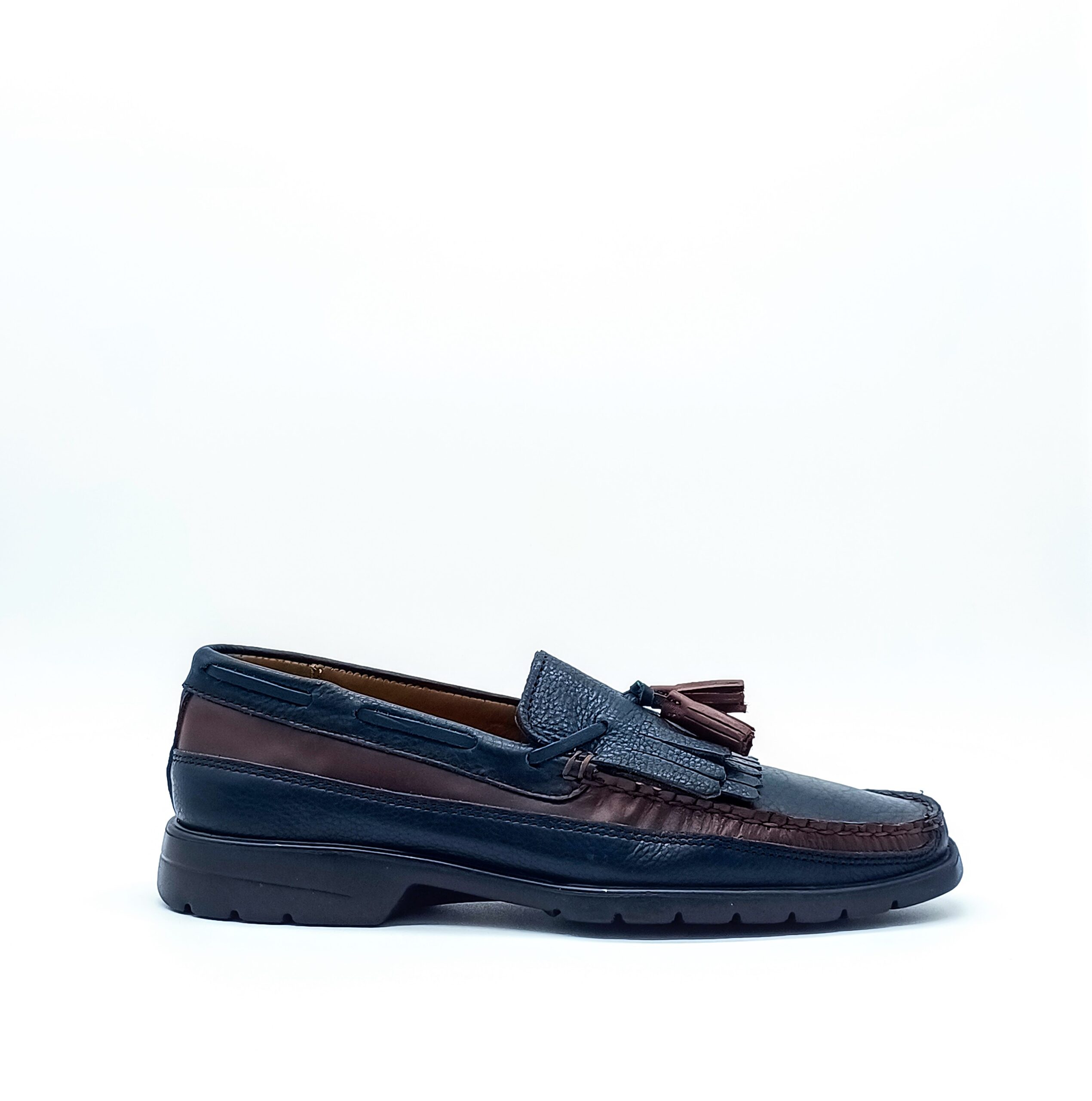 mocasín bitono fabricado 100% en piel Raimbow en combinación de colores caoba y azul, muy ligero y flexible, en su interior cuenta con forro de res y plantilla confort.