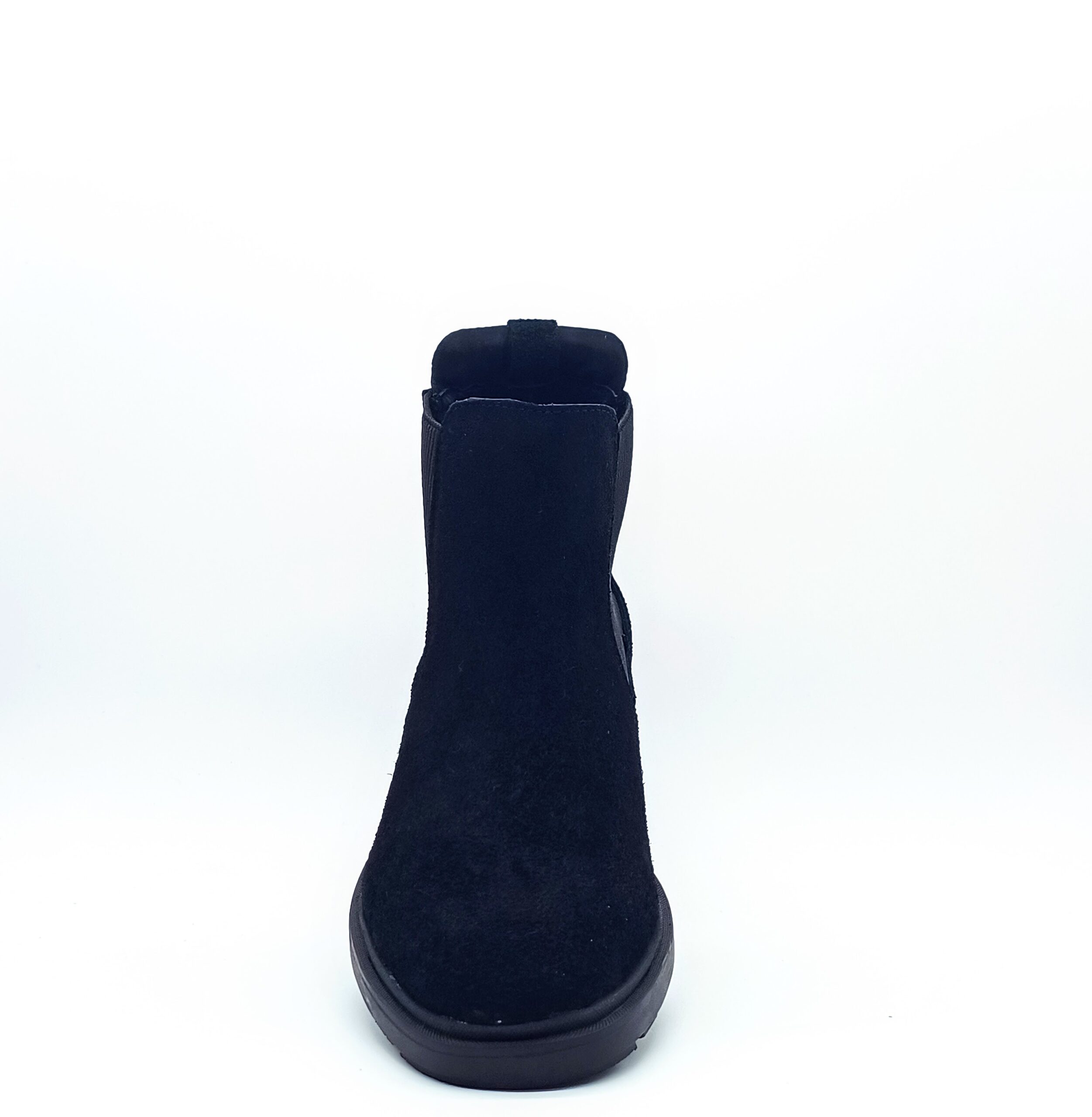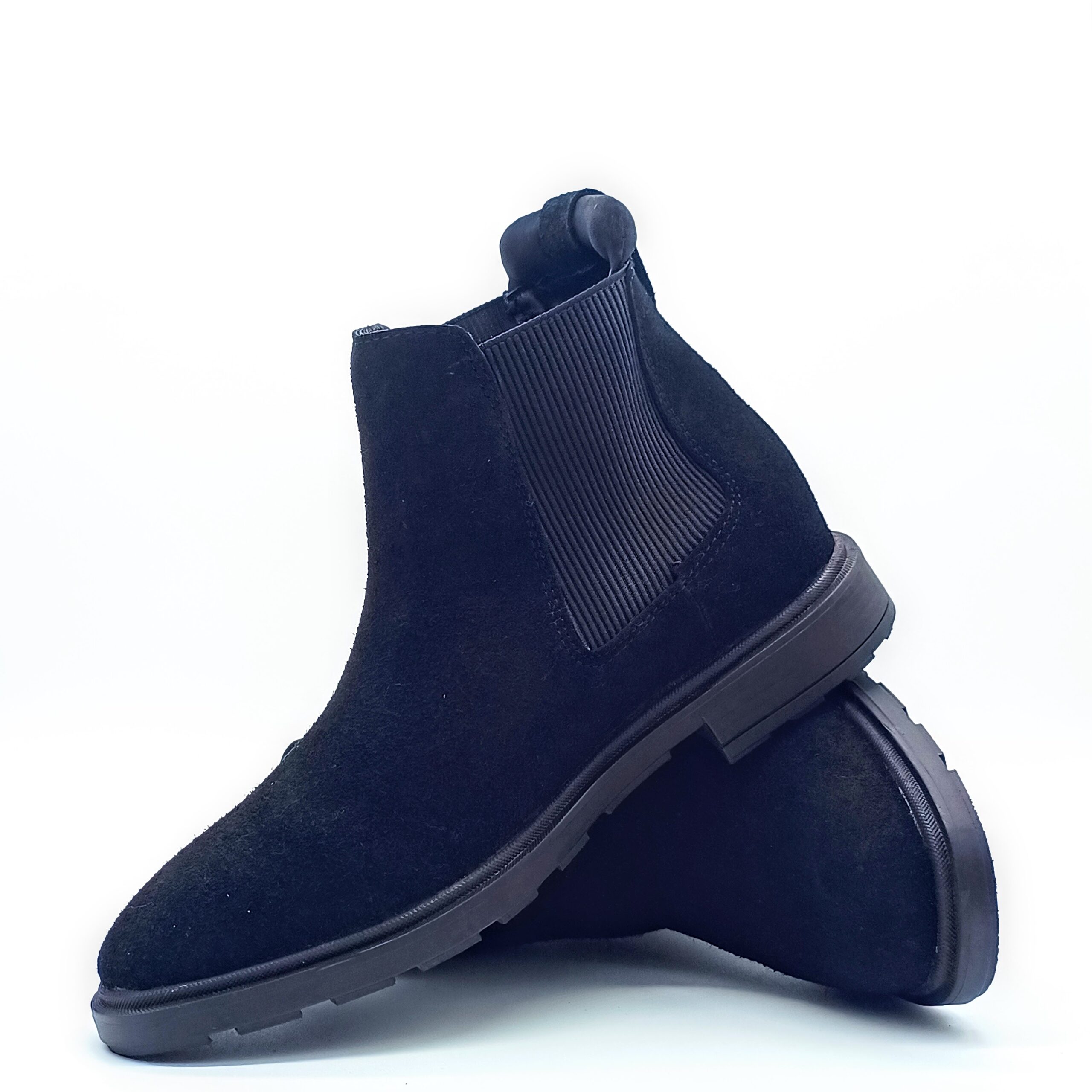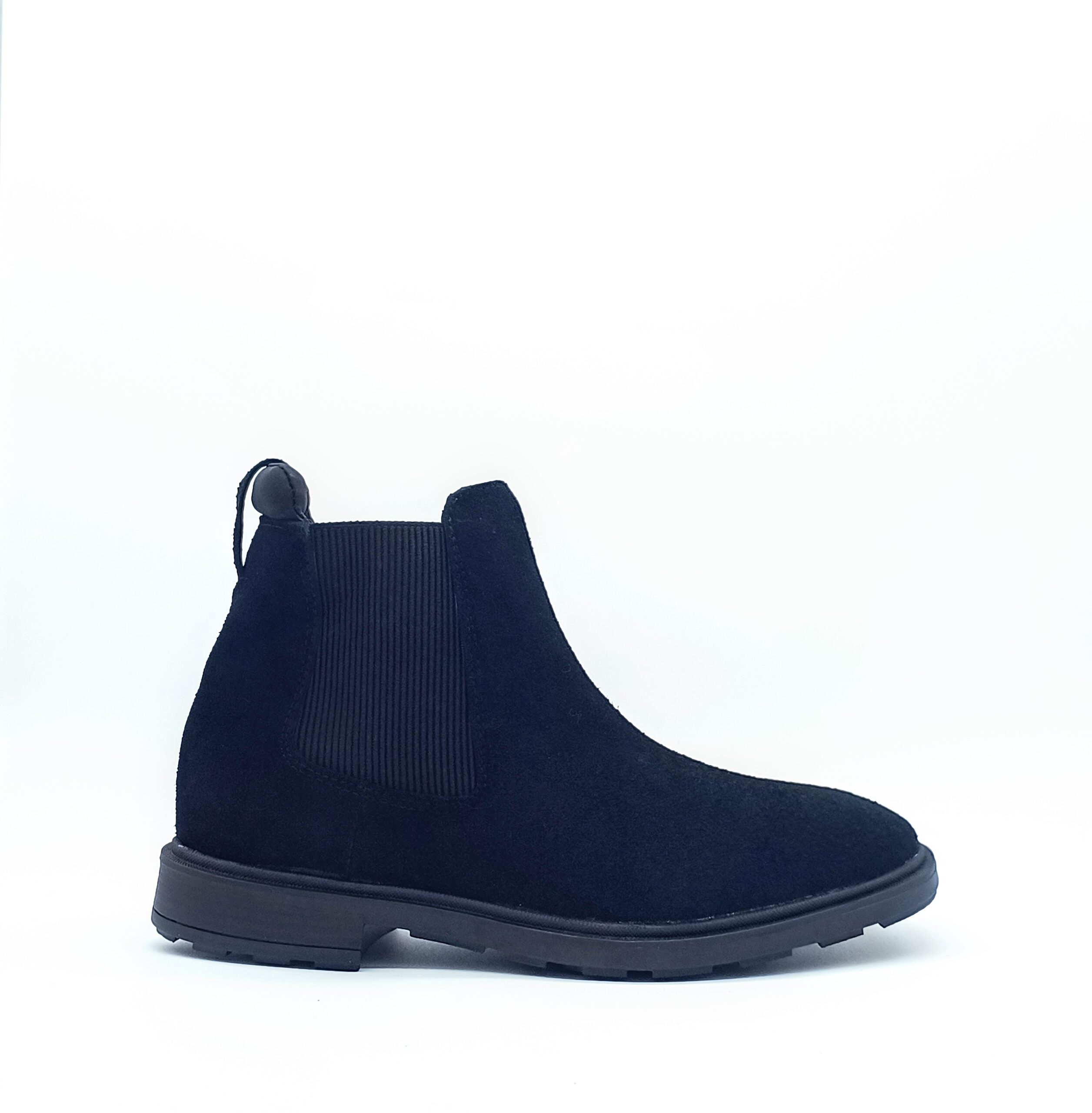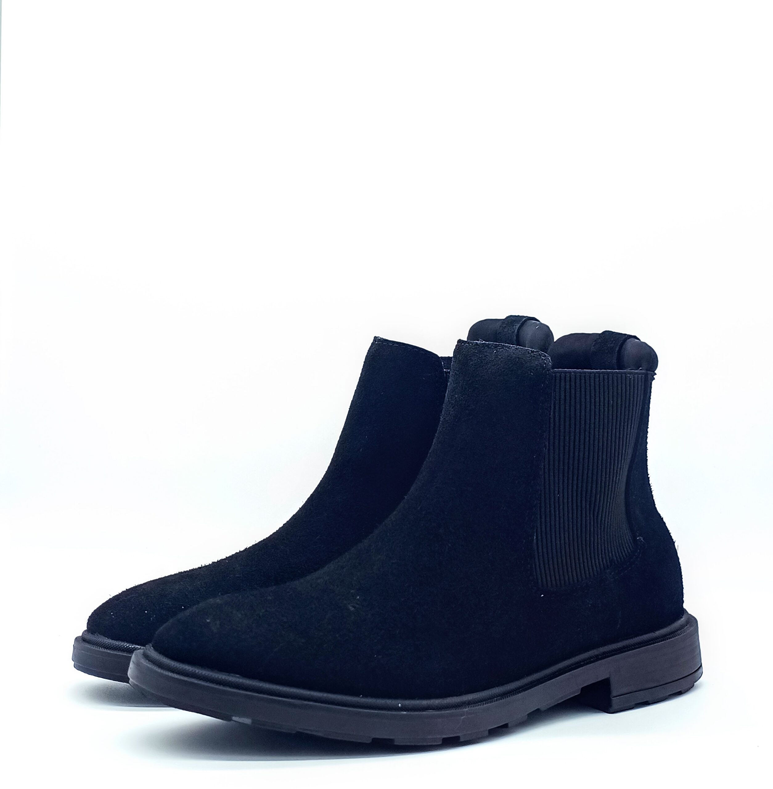 Bota estilo Chelsea elaborada en piel gamuza color negro, cómoda y ligera, en su interior cuenta con forro de res y plantilla confort, así como suela TR.