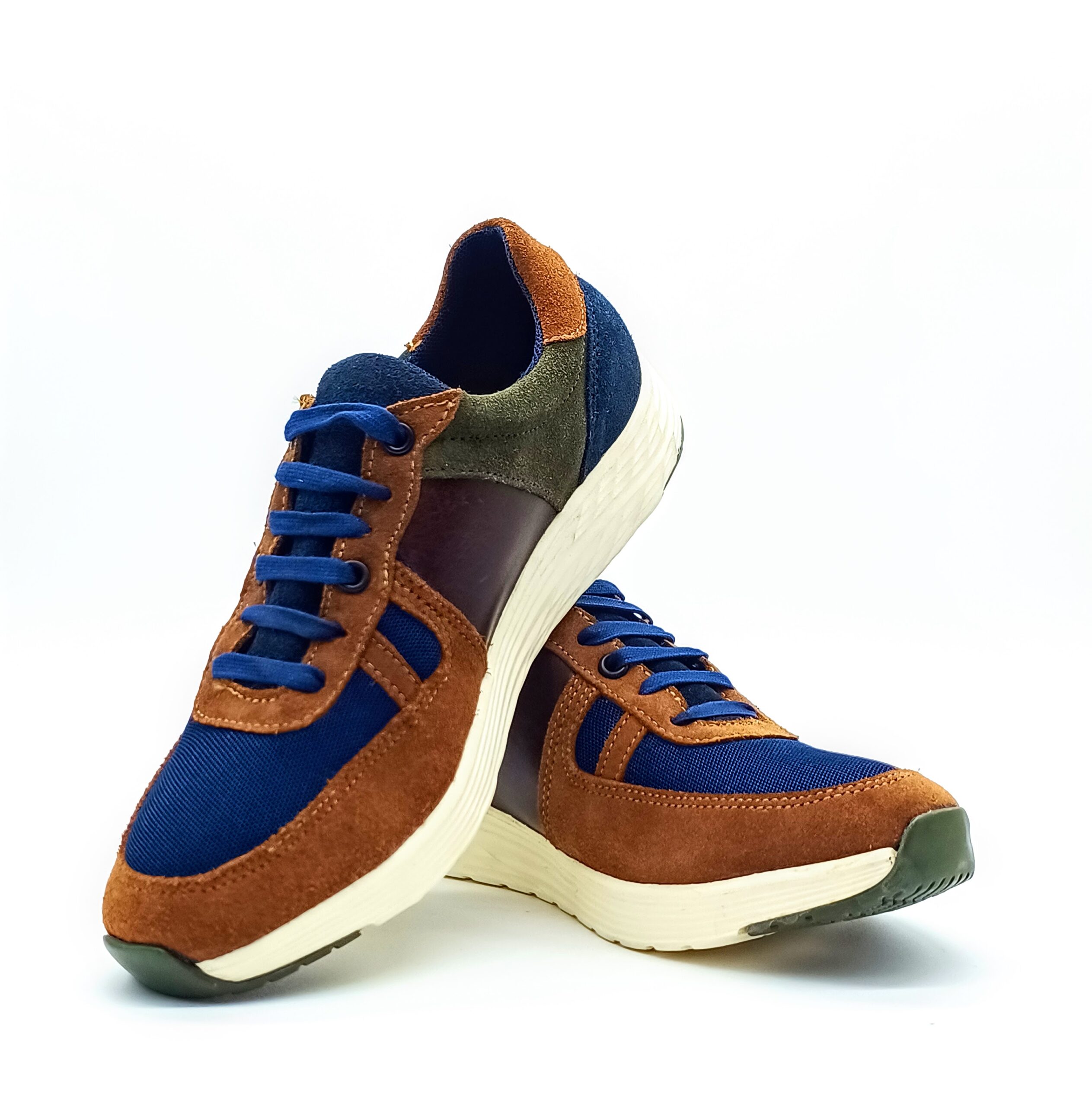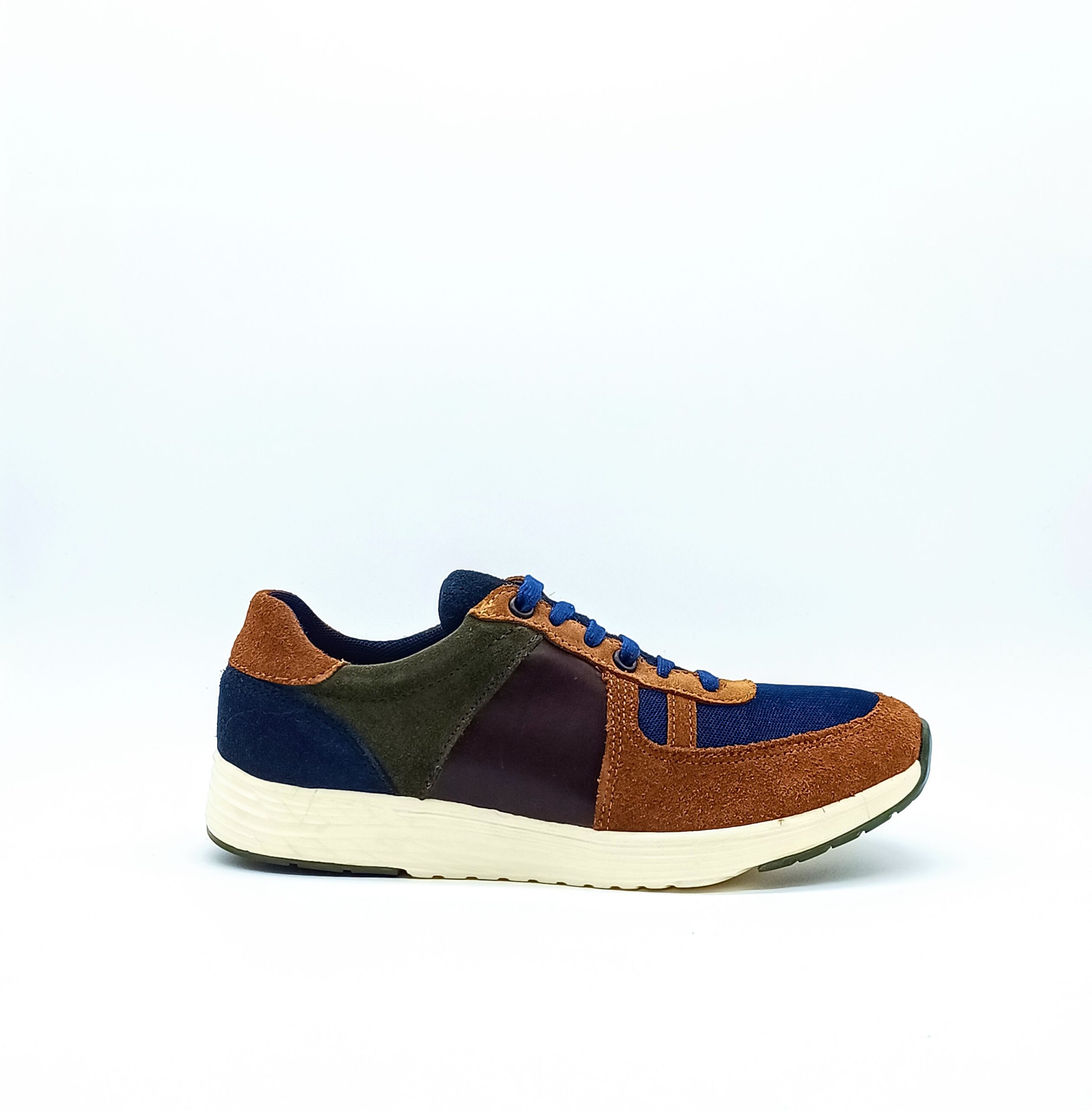 Sneaker fabricado en en combinación de piles, gamuza y piel grasa en colores camel, marino y miel. en su interior cuenta con forro sintético y plantilla confort.