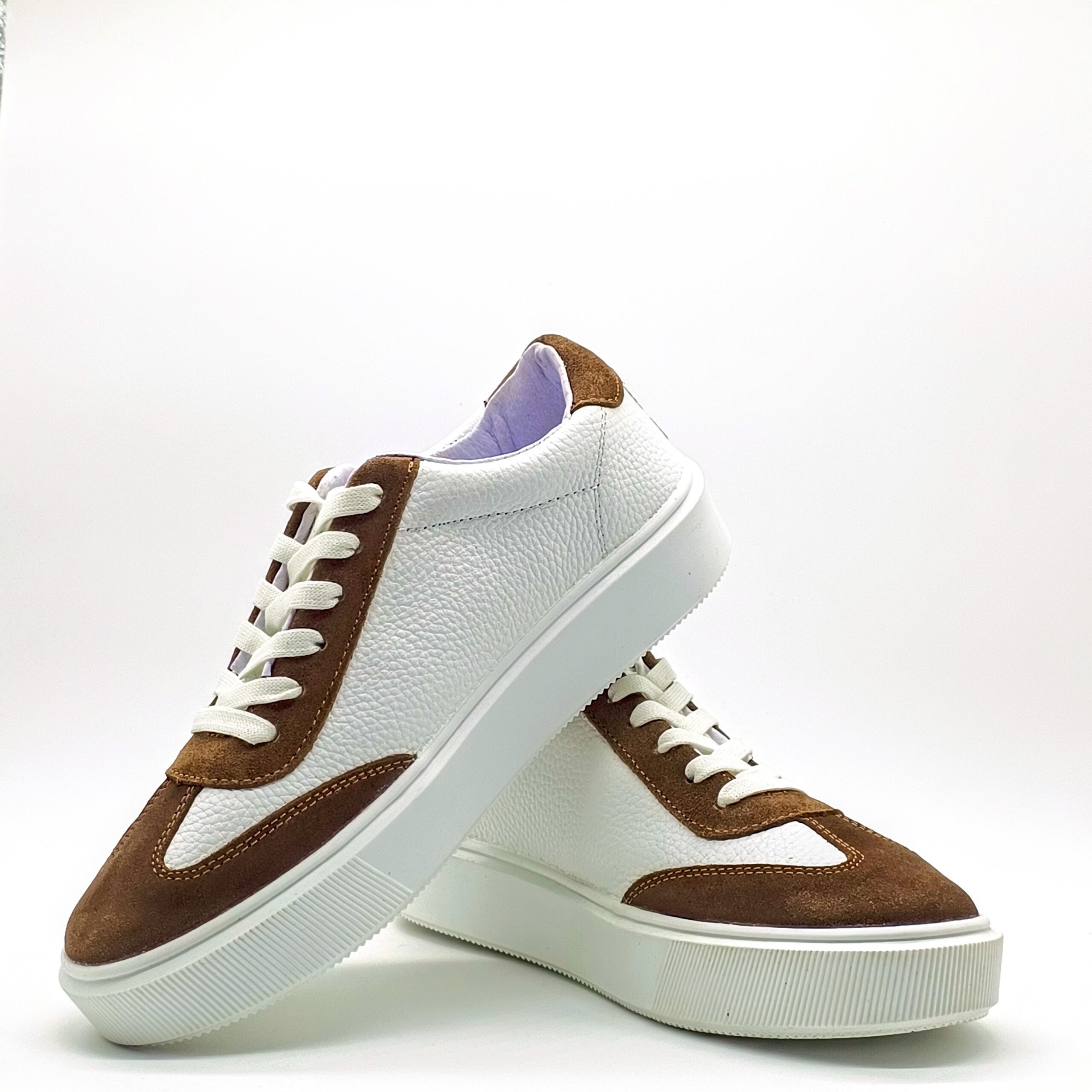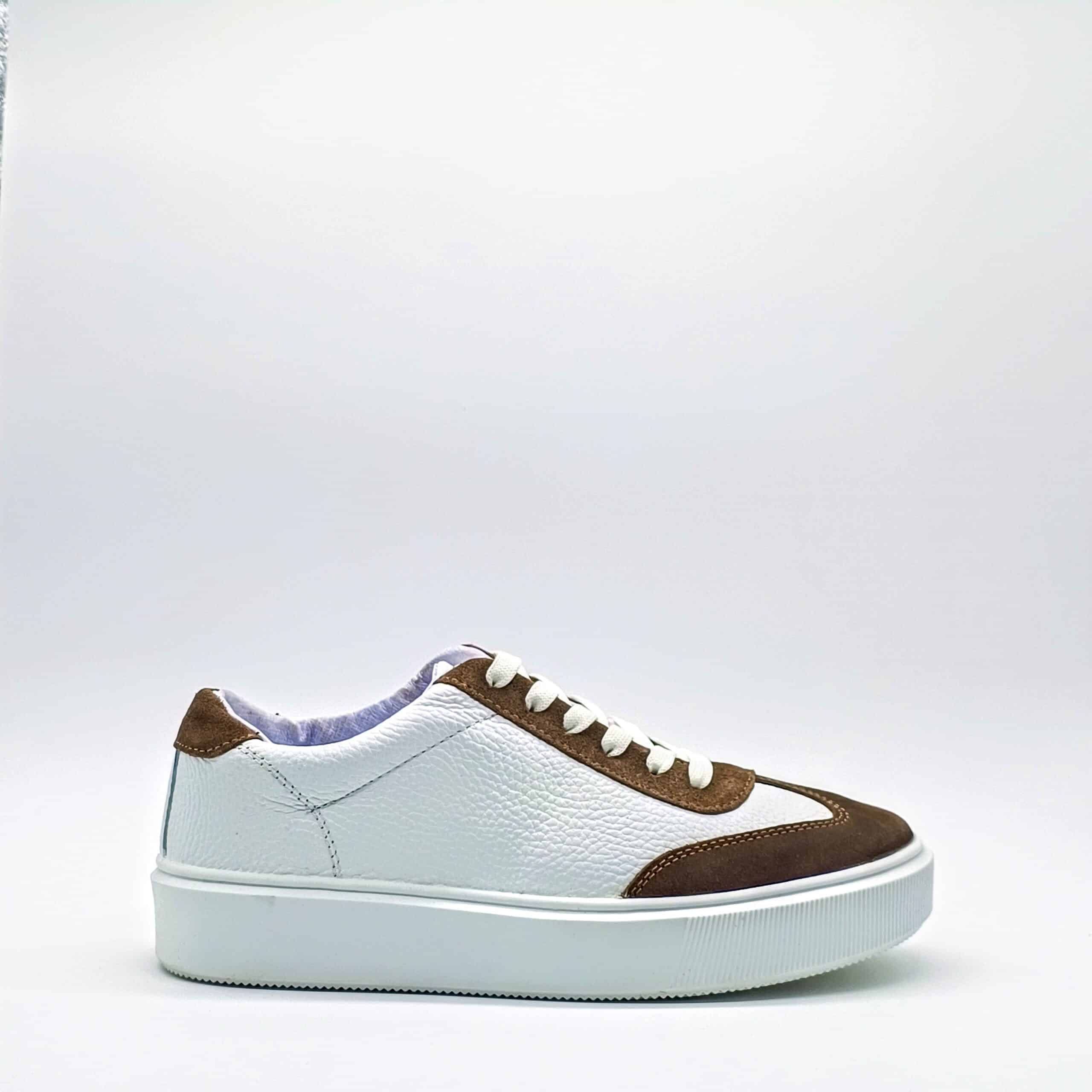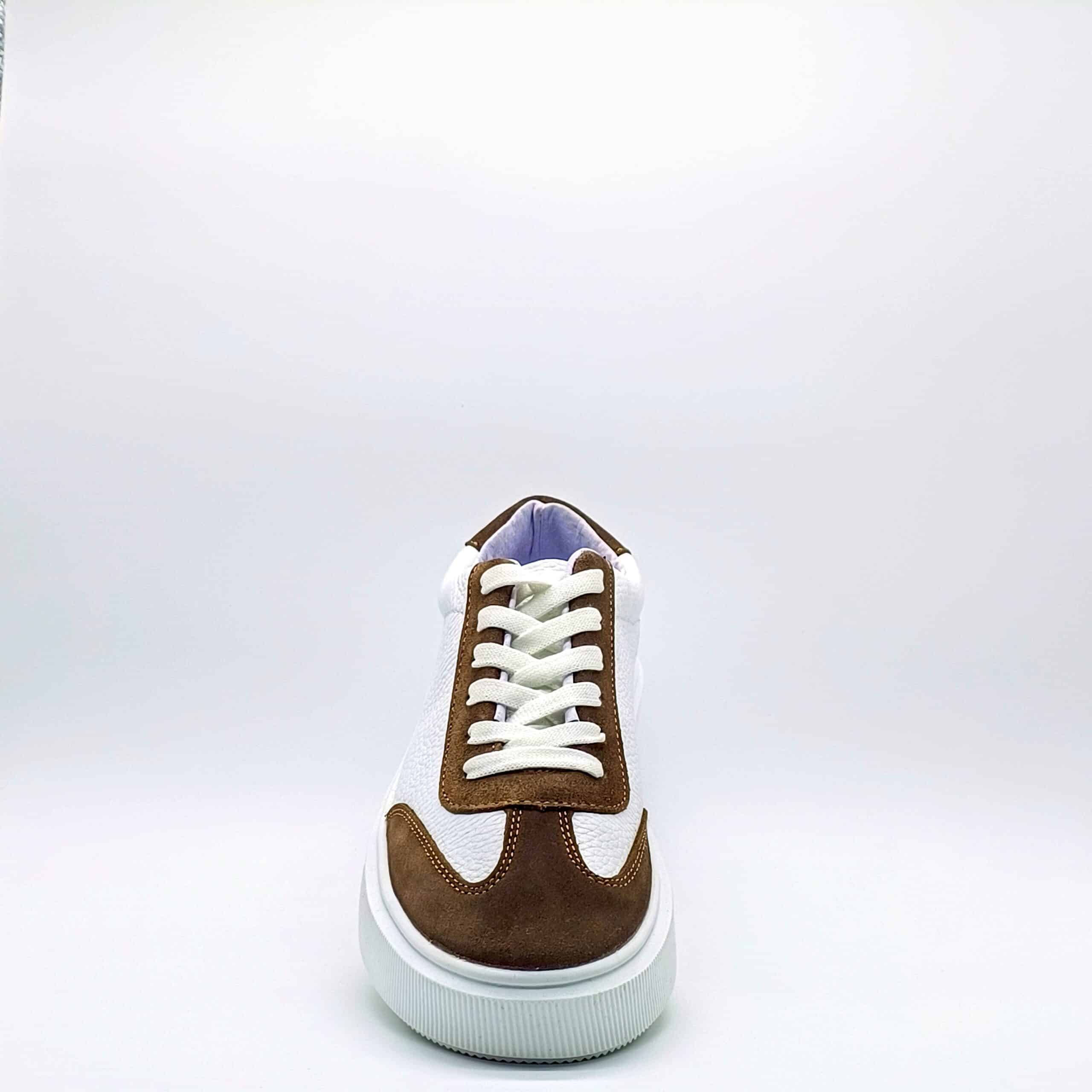 Sneaker bi-tono fabricado 100% en piel de res, su diseño combina el color blanco con contrastes en gamuza color café, en su interior cuenta con forro de cerdo y suela de 3 cm de altura.