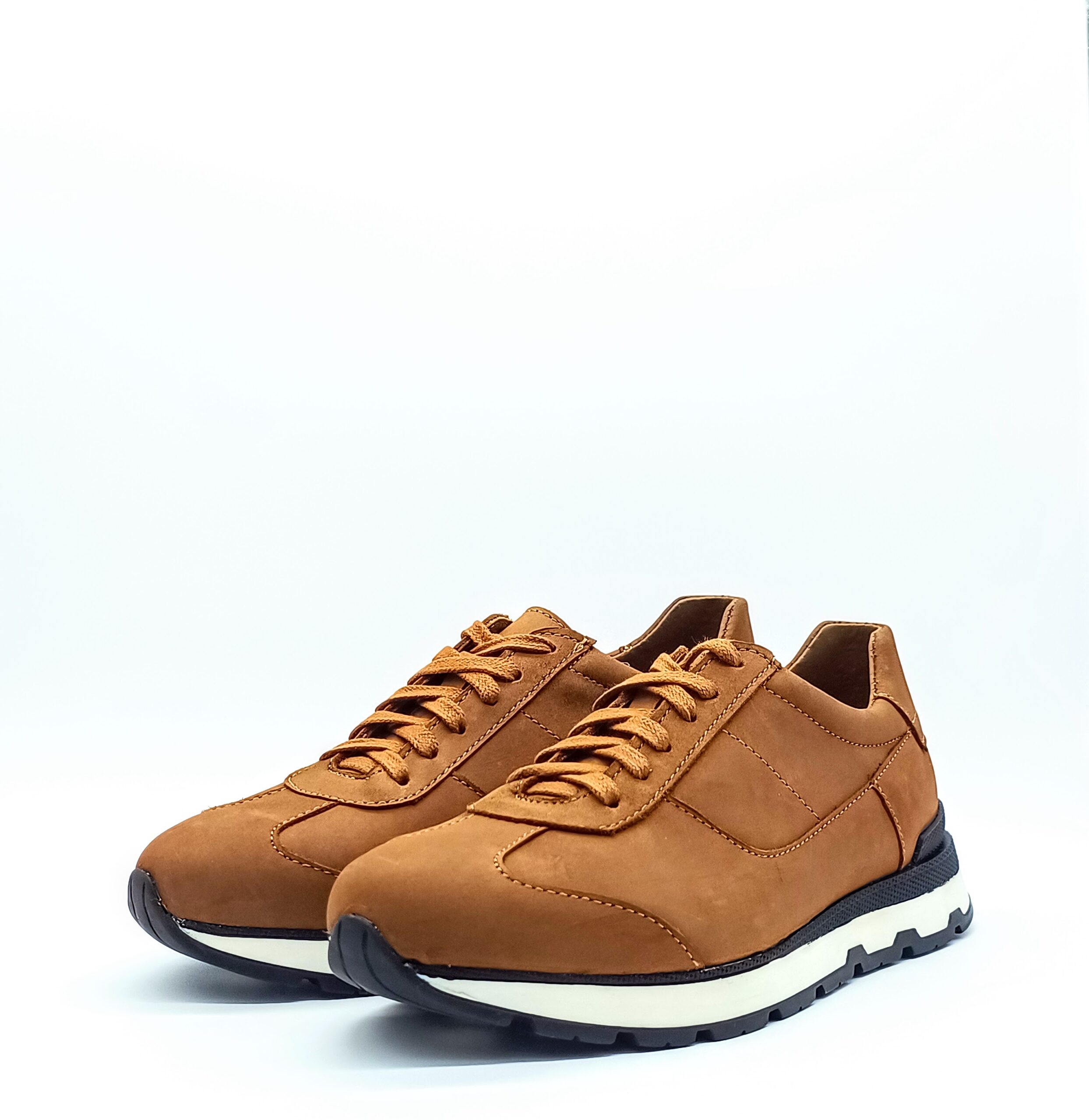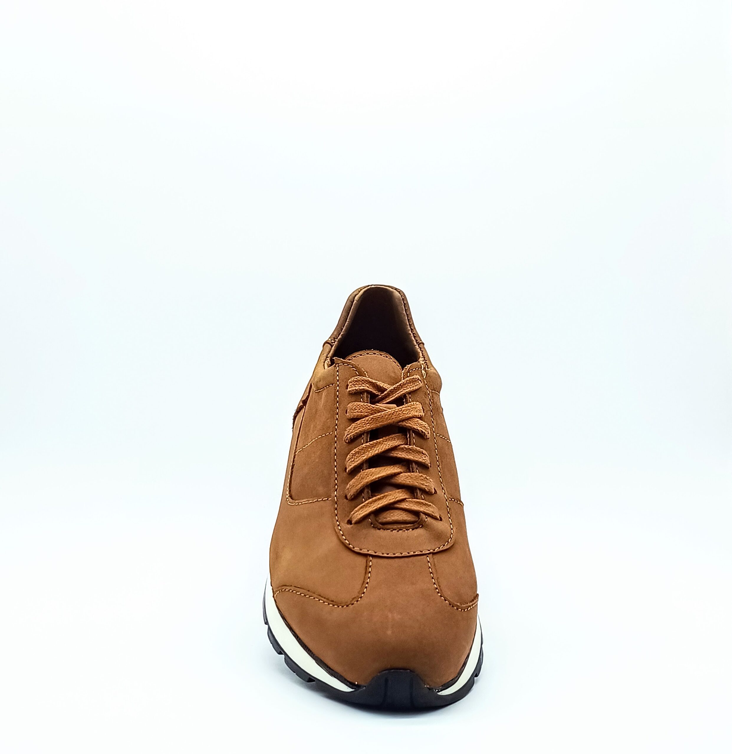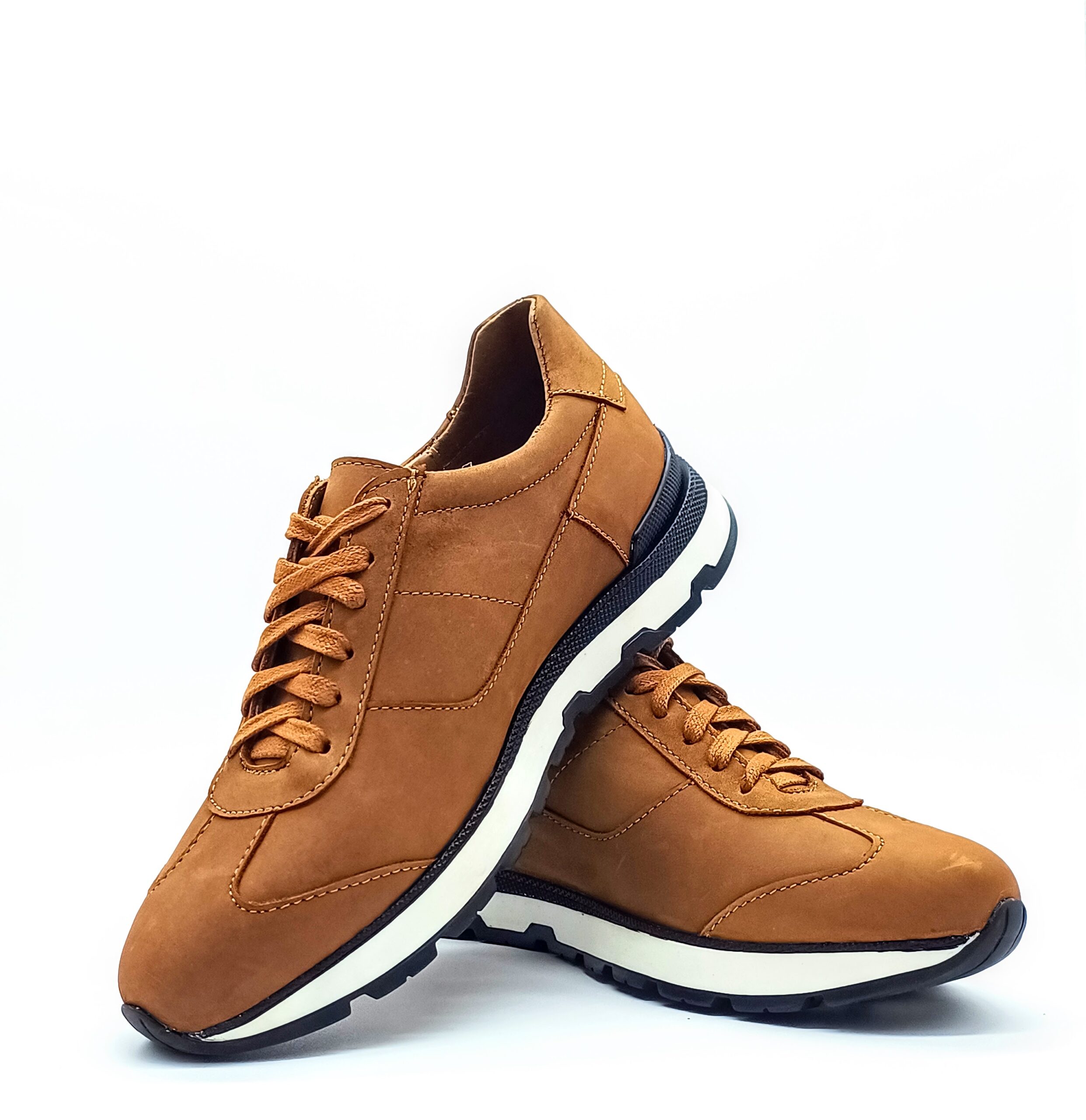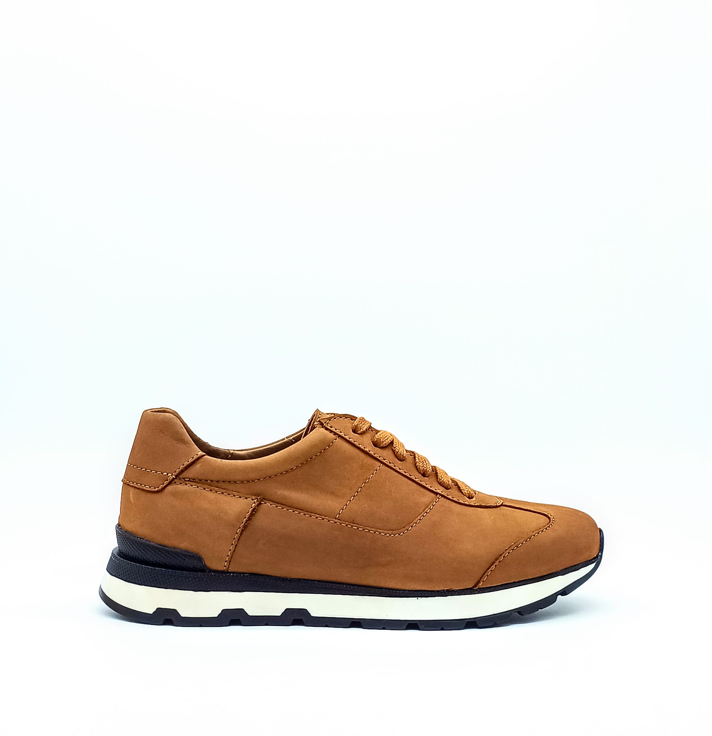 Sneaker elaborado en piel nobuck 100% color bronce, contrasta con su suela blanca con detalle en color negro, en su interior cuenta con forro de res y plantilla confort, diseño casual.