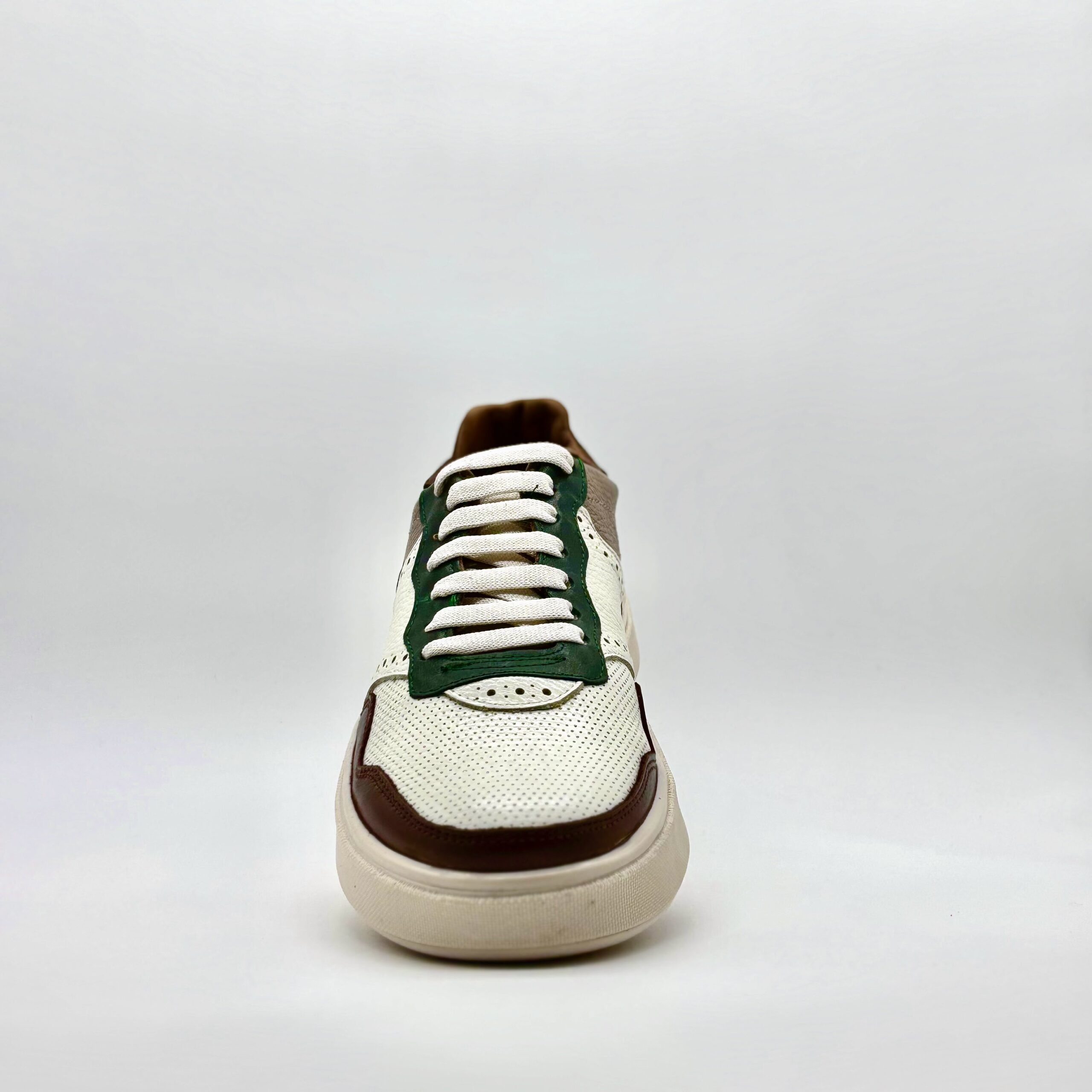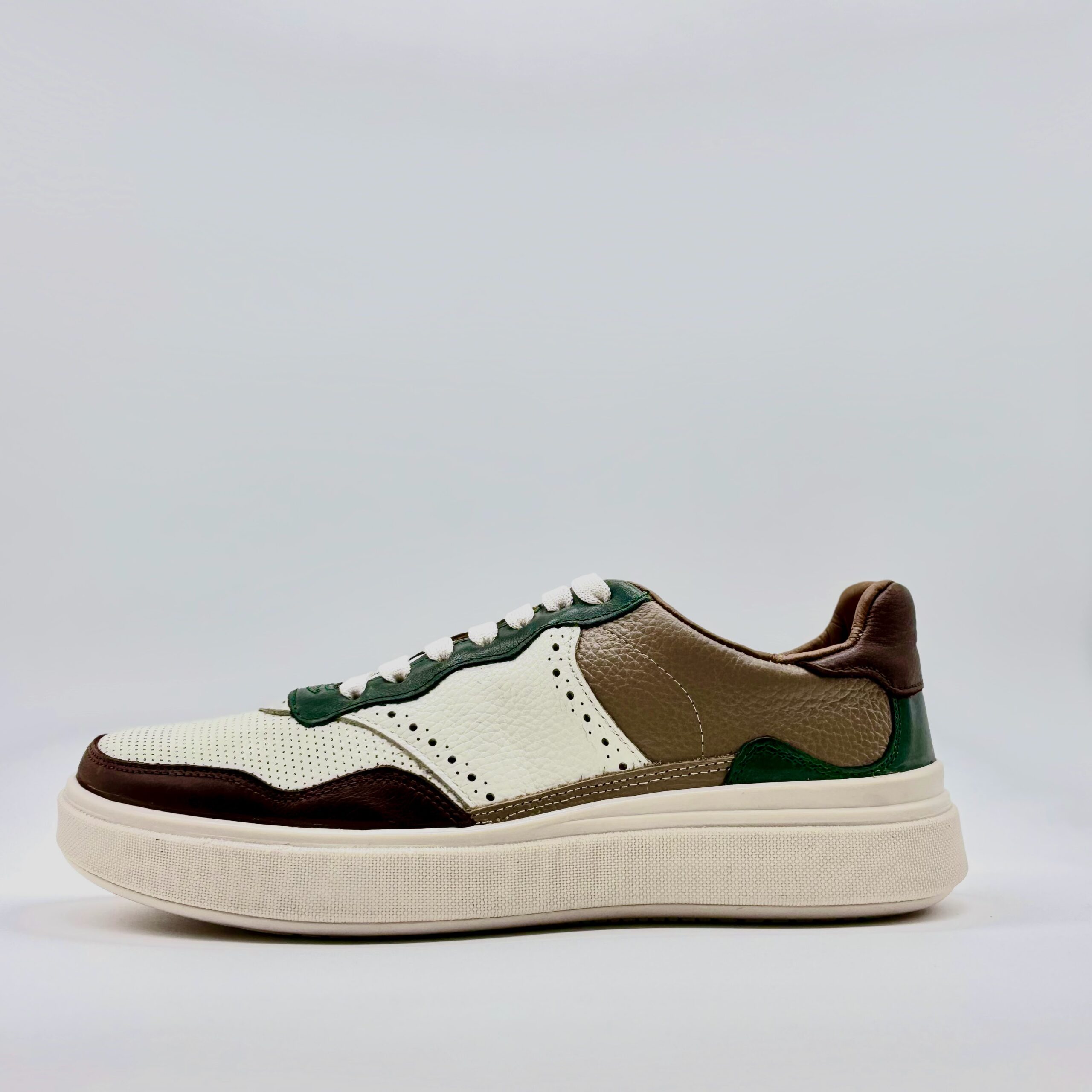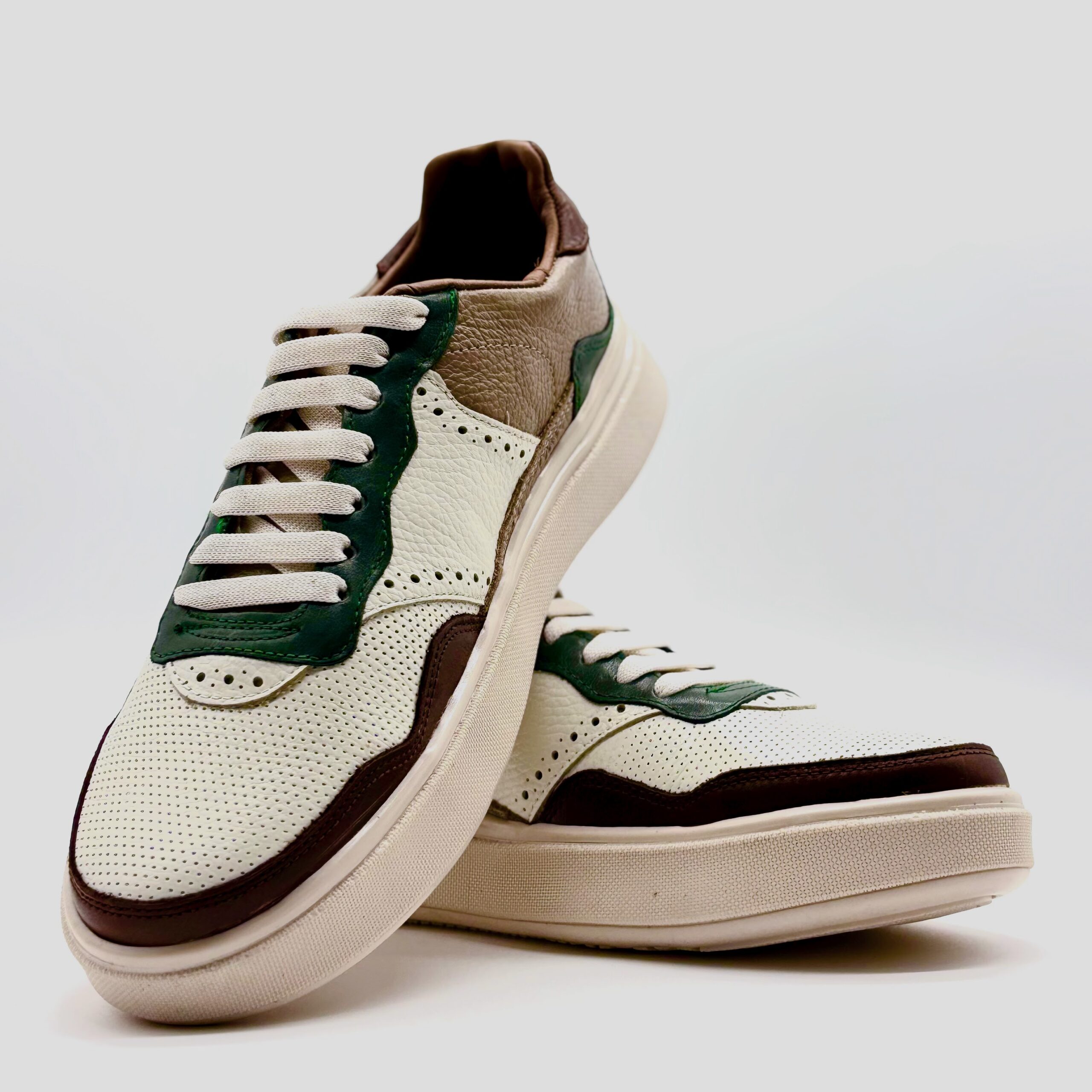 Sneaker fabricado 100% en piel genuina, con combinaciones en verde blanco y cafe, en su interior cuenta con forro de res y plantilla confort, suela TR.