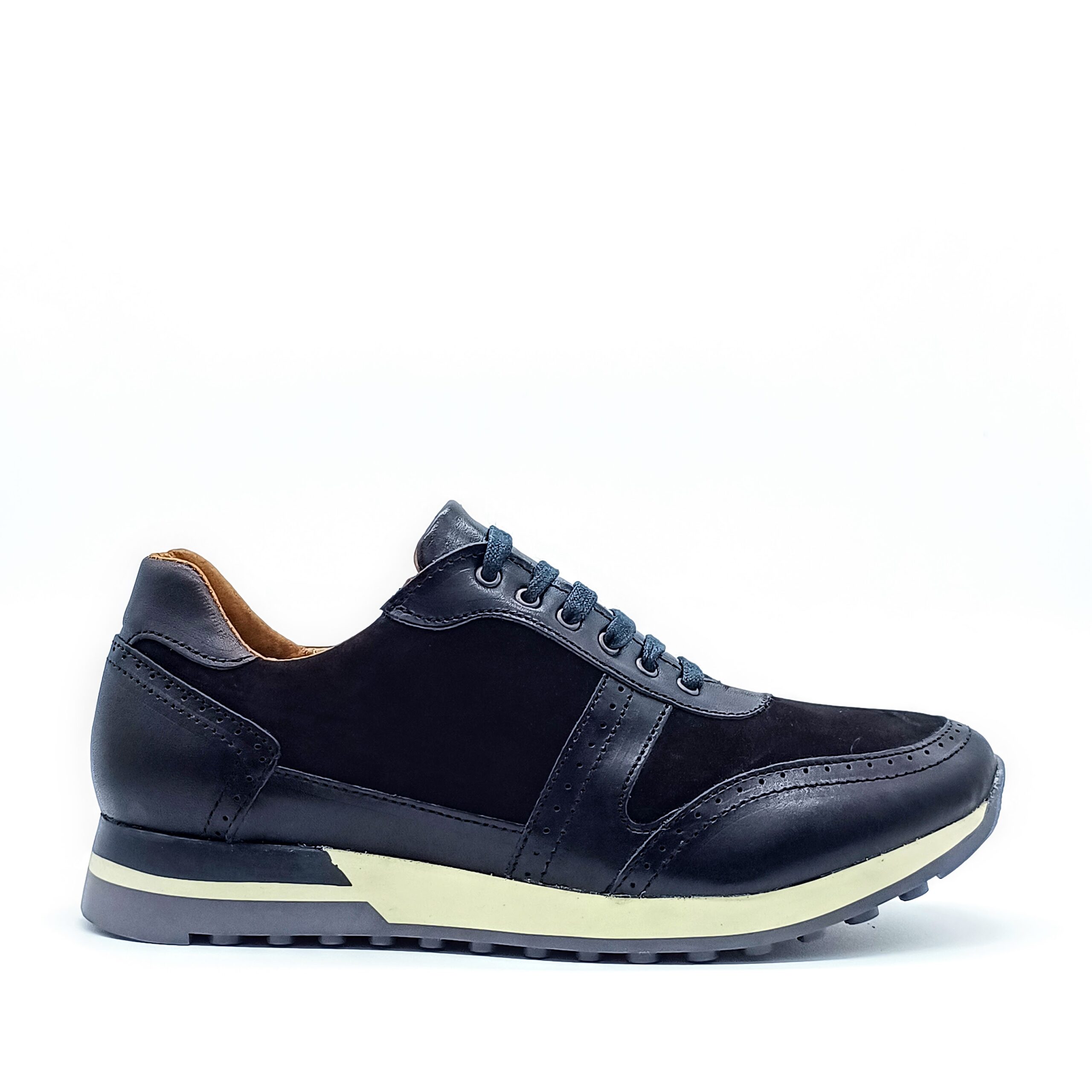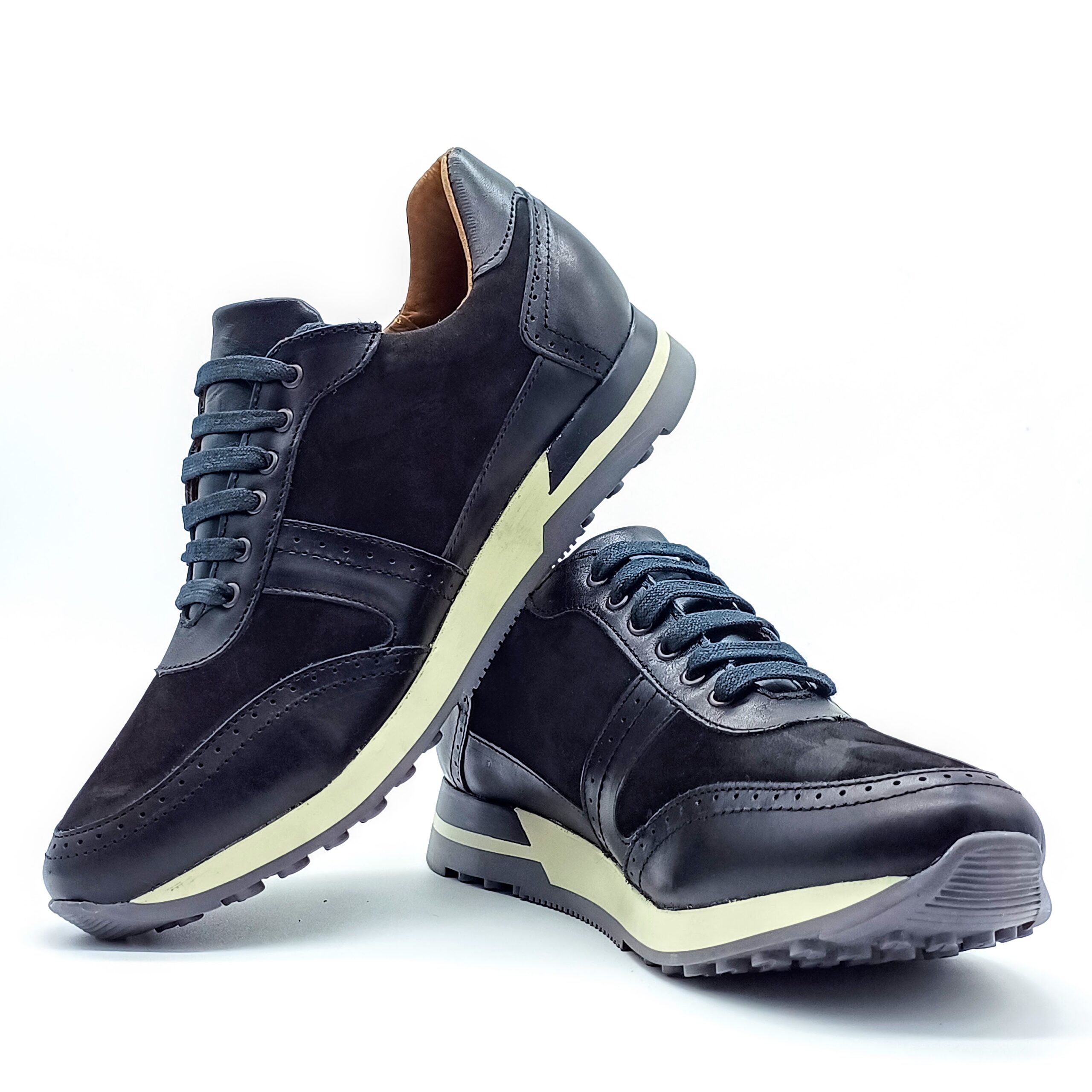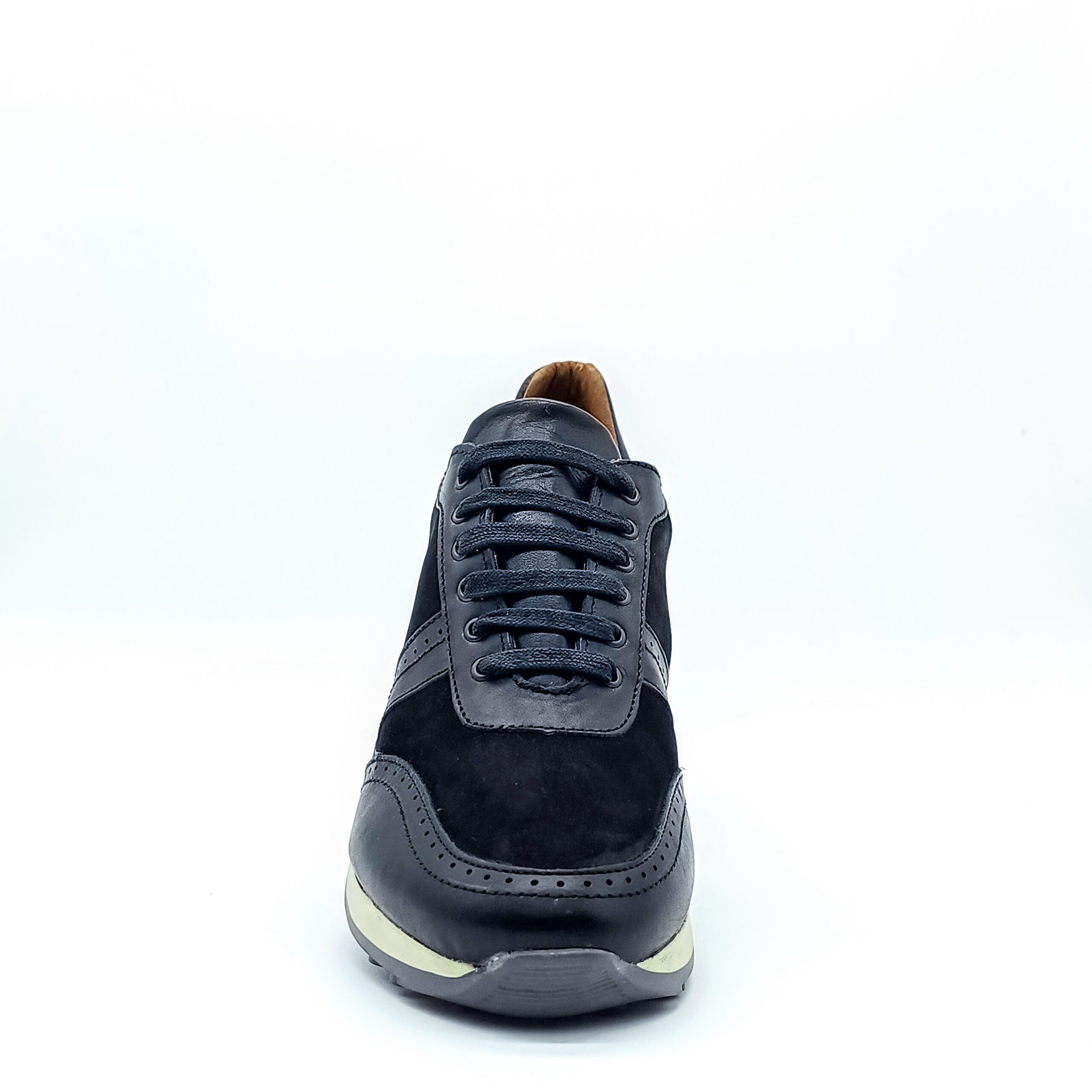 Sneaker elaborado en piel Vitello con contrastes en nobuck, ambas pieles en color negro, su interior es forro de res y plantilla confort, su suela en color blanco con tonos negros combina perfectamente.